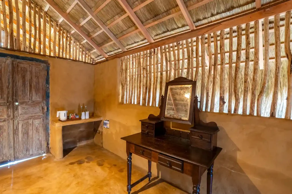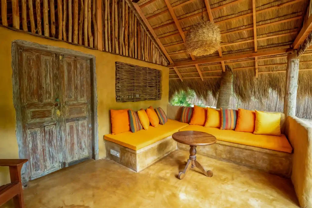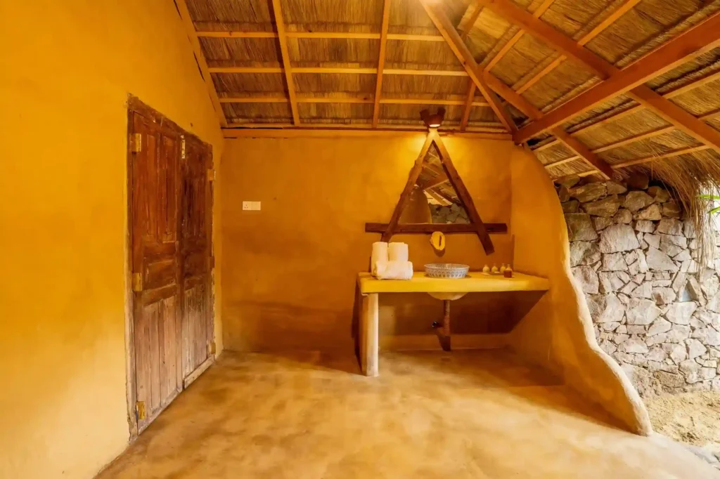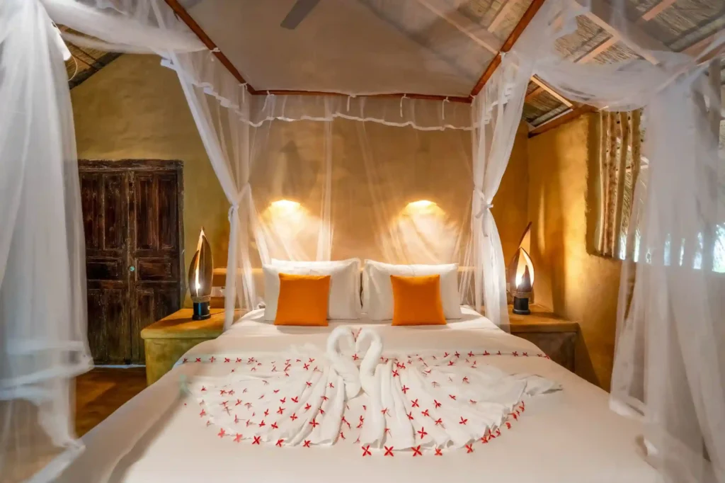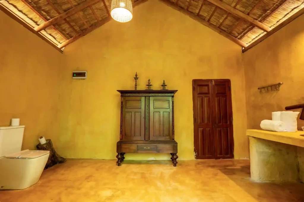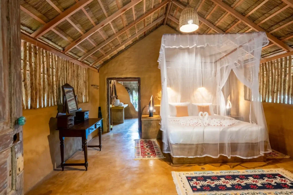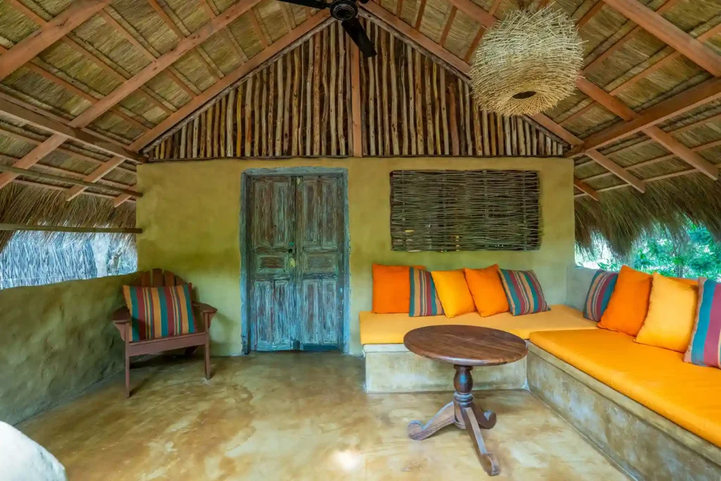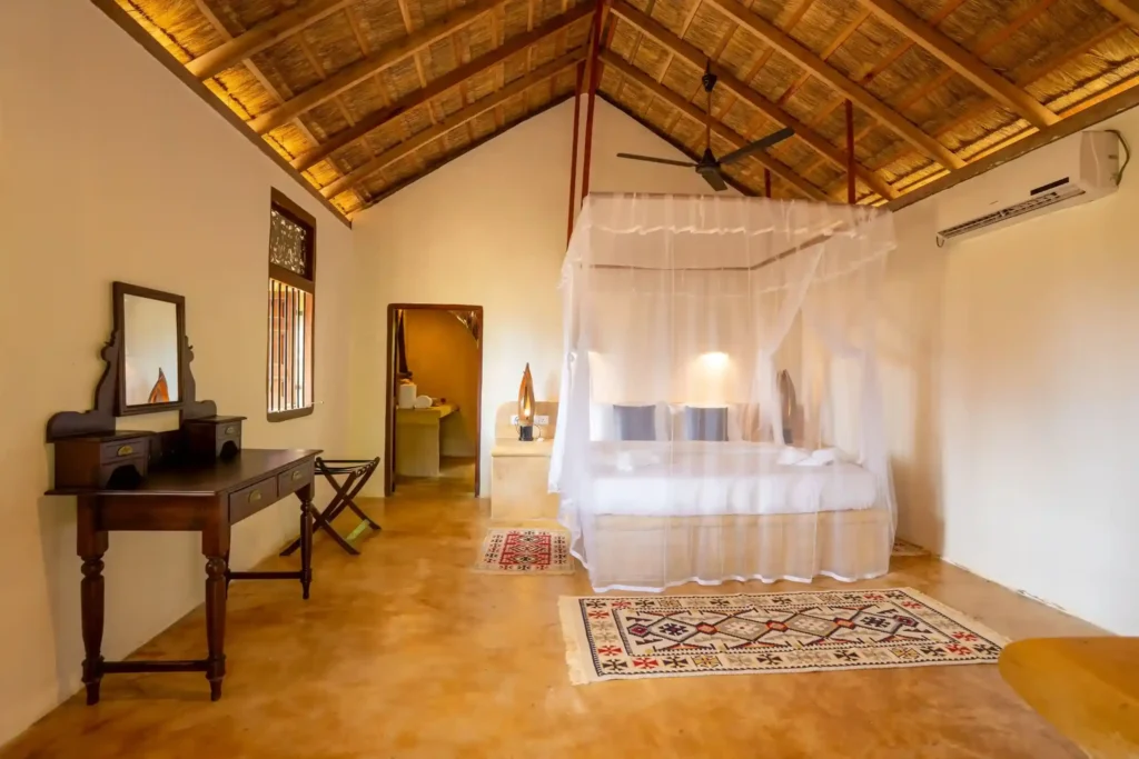 Our Garden Cabanas offer comfort with a touch of nature. Each cabana features a cosy double bedroom that opens onto a shaded veranda, along with a unique open-air bathroom. Shower under the sky, surrounded by palms, and enjoy a stay that feels simple, relaxed, and close to nature.